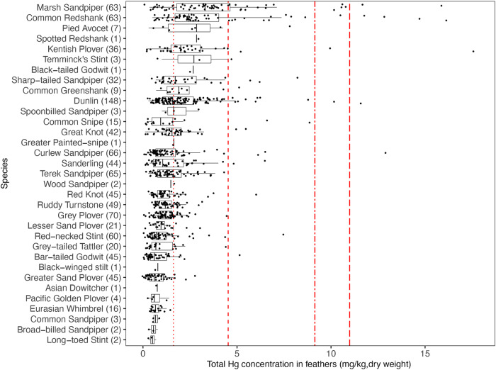 Exposure to pollutants is a potentially crucial but overlooked driver of population declines in shorebirds along the East Asian-Australasian Flyway. We combined knowledge of moult strategy and life history with a standardised sampling protocol to assess mercury (Hg) contamination in 984 individuals across 33 migratory shorebird species on an intercontinental scale. Over one-third of the samples exceeded toxicity benchmarks. Feather Hg was best explained by moulting region, while habitat preference (coastal obligate vs. non-coastal obligate), the proportion of invertebrates in the diet and foraging stratum (foraging mostly on the surface vs. at depth) also contributed, but were less pronounced. Feather Hg was substantially higher in South China (Mai Po and Leizhou), Australia and the Yellow Sea than in temperate and Arctic breeding ranges. Non-coastal obligate species (Tringa genus) frequently encountered in freshwater habitats were at the highest risk. It is important to continue and expand biomonitoring research to assess how other pollutants might impact shorebirds.