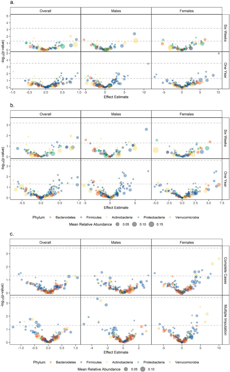 Background: Identifying modifiable risk factors of autism spectrum disorders (ASDs) may inform interventions to reduce financial burden. The infant/toddler gut microbiome is one such feature that has been associated with social behaviors, but results vary between cohorts. We aimed to identify consistent overall and sex-specific associations between the early-life gut microbiome and autism-related behaviors.