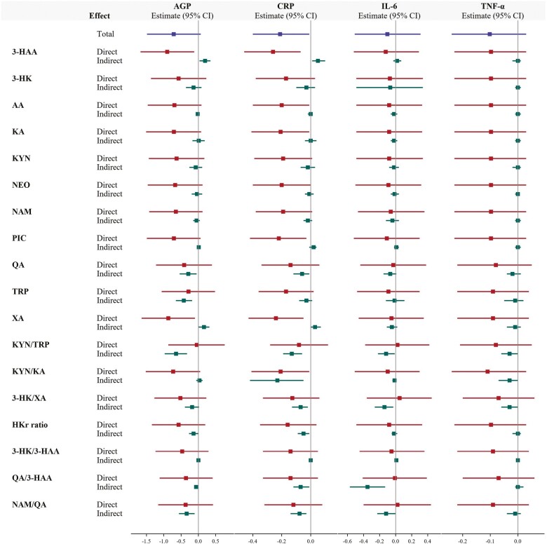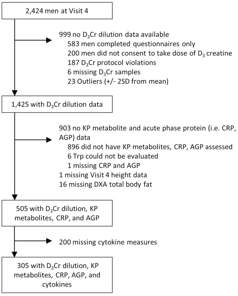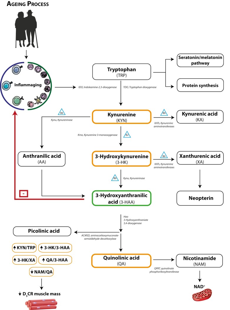 Tryptophan (TRP) metabolites along the kynurenine (KYN) pathway (KP) have been found to influence muscle. Proinflammatory cytokines are known to stimulate the degradation of TRP down the KP. Given that both inflammation and KP metabolites have been connected with loss of muscle, we assessed the potential mediating role of KP metabolites on inflammation and muscle mass in older men. Five hundred and five men (85.0 ± 4.2 years) from the Osteoporotic Fractures in Men cohort study with measured D3-creatine dilution (D3Cr) muscle mass, KP metabolites, and inflammation markers (C-reactive protein [CRP], alpha-1-acid glycoprotein [AGP] and a subsample [n = 305] with interleukin [IL-6, IL-1β, IL-17A] and tumor necrosis factor-α [TNF-α]) were included in the analysis. KP metabolites and inflammatory markers were measured using liquid chromatography-tandem mass spectrometry and immunoassays, respectively. 23%-92% of the inverse relationship between inflammatory markers and D3Cr muscle mass was mediated by KP metabolites (indirect effect p < .05). 3-hydroxyanthranilic acid (3-HAA), quinolinic acid (QA), TRP, xanthurenic acid (XA), KYN/TRP, 3-hydroxykynurenine (3-HK)/3-HAA, QA/3-HAA, and nicotinamide (NAM)/QA mediated the AGP relationship. 3-HAA, QA, KYN/TRP, 3-HK/XA, HKr ratio, 3-HK/3-HAA, QA/3-HAA, and NAM/QA mediated the CRP. KYN/TRP, 3-HK/XA, and NAM/QA explained the relationship for IL-6 and 3-HK/XA and QA/3-HAA for TNF-α. No mediation effect was observed for the other cytokines (indirect effect p > .05). KP metabolites, particularly higher ratios of KYN/TRP, 3-HK/XA, 3-HK/3-HAA, QA/3-HAA, and a lower ratio of NAM/QA, mediated the relationship between inflammation and low muscle mass. Our preliminary cross-sectional data suggest that interventions to alter D3Cr muscle mass may focus on KP metabolites rather than inflammation per se.
