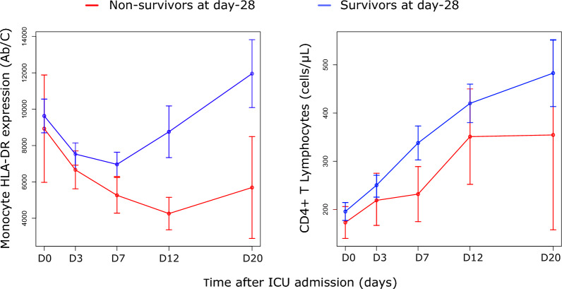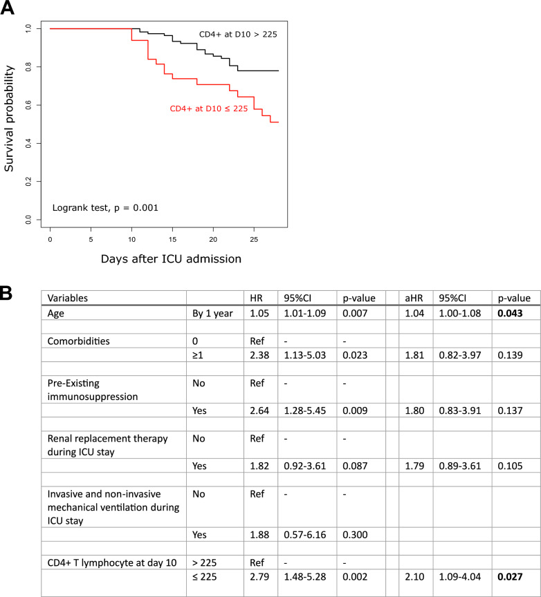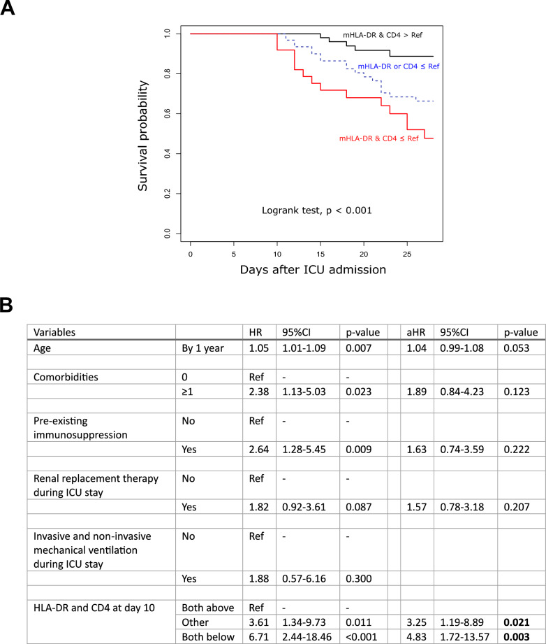 Results: To analyze monocyte HLA-DR expression (mHLA-DR) and CD4 + T lymphocyte count (CD4) in critically ill COVID-19 patients after a dexamethasone course and evaluate their association with 28-day ICU mortality, adult COVID-19 patients (n = 176) with an ICU length of stay of at least 10 days and under dexamethasone treatment were included. Associations between each biomarker value (or in combination) measured at day 10 after ICU admission and 28-day mortality in ICU were evaluated. At day 10, the majority of patients presented decreased values of both parameters. A significant association between low mHLA-DR and 28-day mortality was observed. This association remained significant in a multivariate analysis including age, comorbidities or pre-existing immunosuppression (adjusted Hazard ratio (aHR) = 2.86 [1.30-6.32], p = 0.009). Similar results were obtained with decreased CD4 + T cell count (aHR = 2.10 [1.09-4.04], p = 0.027). When combining these biomarkers, patients with both decreased mHLA-DR and low CD4 presented with an independent and significant elevated risk of 28-day mortality (i.e., 60%, aHR = 4.83 (1.72-13.57), p = 0.001).
