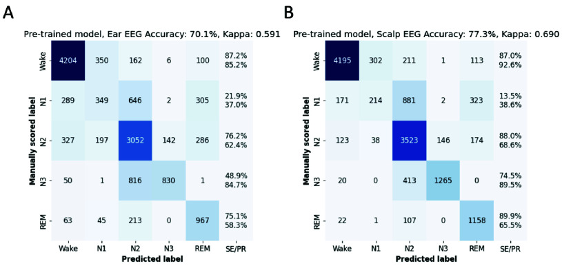 Results: Results show that the initial accuracy of the pre-trained model on ear-EEG was 70.1%, but fine-tuning the model with ear-EEG data improved its classification accuracy to 73.7%. The fine-tuned model exhibited a statistically significant improvement (p < 0.05, dependent t-test) for 10 out of the 13 participants, as reflected by an enhanced average Cohen's kappa score (a statistical measure of inter-rater agreement for categorical items) of 0.639, indicating a stronger agreement between automated and expert classifications of sleep stages. Comparative SHAP value analysis revealed a shift in feature importance for the N3 sleep stage, underscoring the effectiveness of the fine-tuning process.