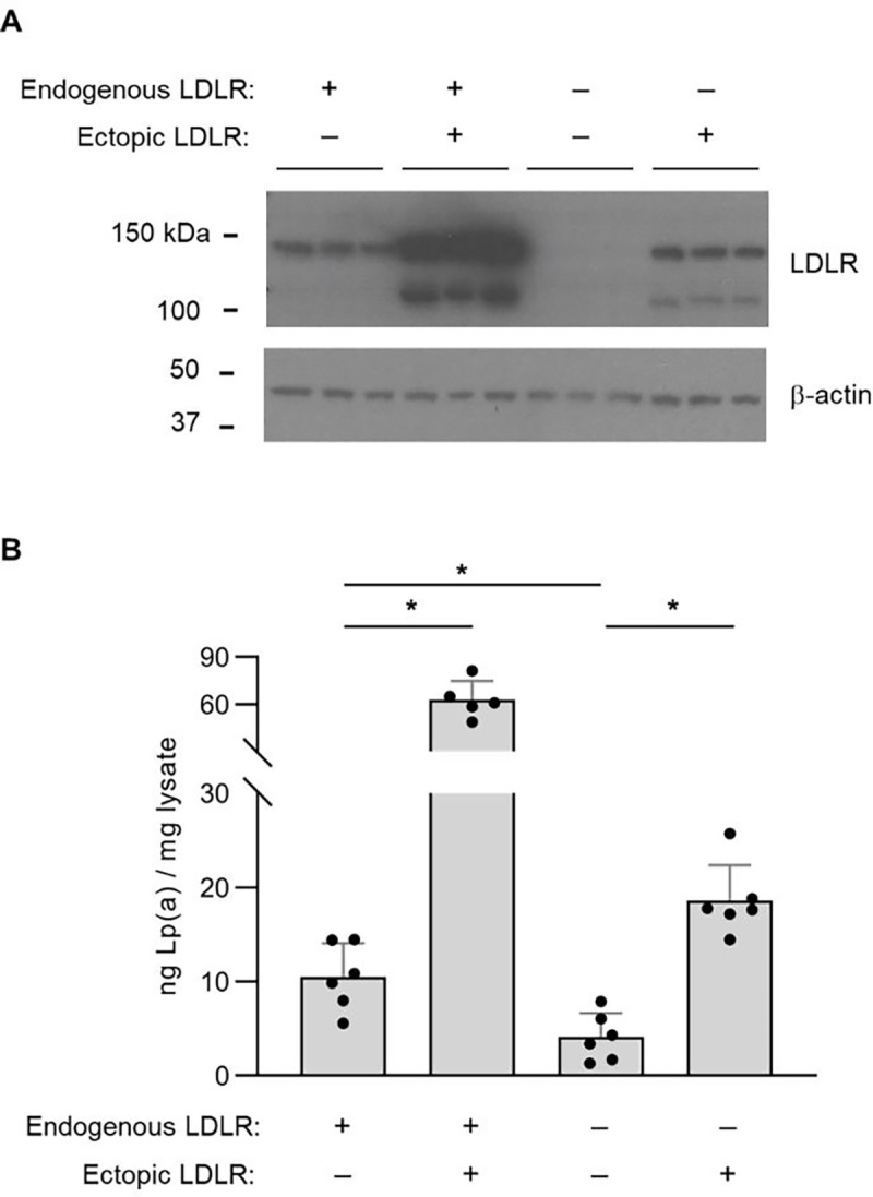 An elevated level of lipoprotein(a), or Lp(a), in the bloodstream has been causally linked to the development of atherosclerotic cardiovascular disease and calcific aortic valve stenosis. Steady state levels of circulating lipoproteins are modulated by their rate of clearance, but the identity of the Lp(a) uptake receptor(s) has been controversial. In this study, we performed a genome-scale CRISPR screen to functionally interrogate all potential Lp(a) uptake regulators in HuH7 cells. Strikingly, the top positive and negative regulators of Lp(a) uptake in our screen were LDLR and MYLIP, encoding the LDL receptor and its ubiquitin ligase IDOL, respectively. We also found a significant correlation for other genes with established roles in LDLR regulation. No other gene products, including those previously proposed as Lp(a) receptors, exhibited a significant effect on Lp(a) uptake in our screen. We validated the functional influence of LDLR expression on HuH7 Lp(a) uptake, confirmed in vitro binding between the LDLR extracellular domain and purified Lp(a), and detected an association between loss-of-function LDLR variants and increased circulating Lp(a) levels in the UK Biobank cohort. Together, our findings support a central role for the LDL receptor in mediating Lp(a) uptake by hepatocytes.