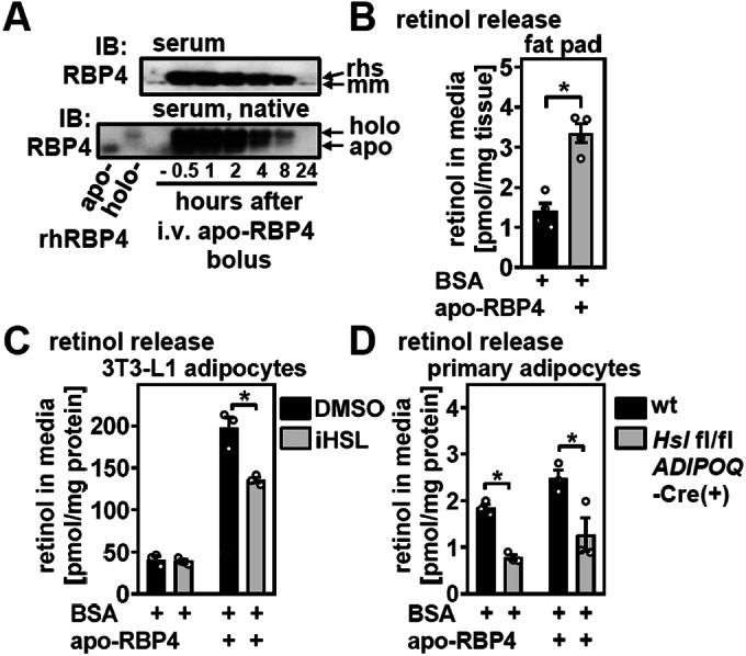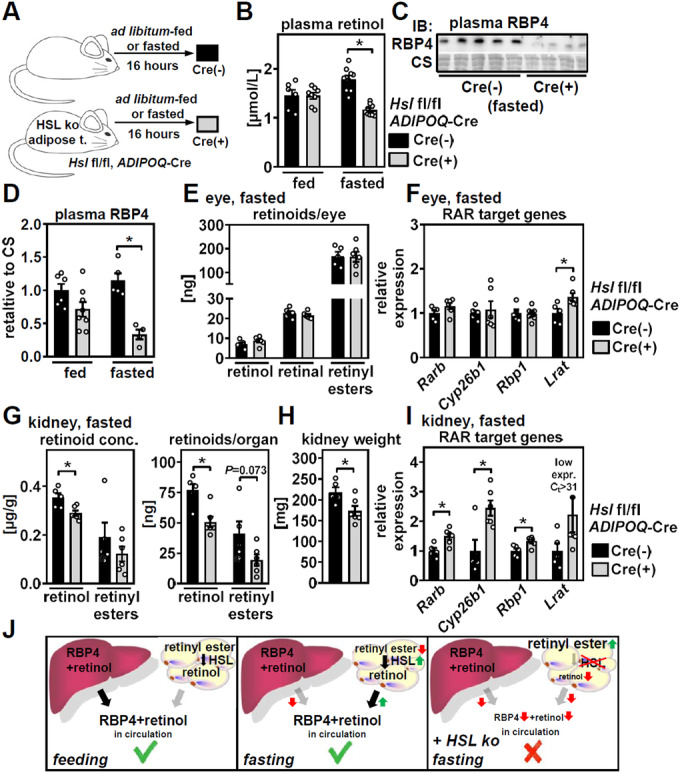 Vitamin A (retinol) is distributed via the blood bound to its specific carrier protein, retinol-binding protein 4 (RBP4). Retinol-loaded RBP4 is secreted into the circulation exclusively from hepatocytes, thereby mobilizing hepatic retinoid stores that represent the major vitamin A reserves in the body. The relevance of extrahepatic retinoid stores for circulating retinol and RBP4 levels that are usually kept within narrow physiological limits is unknown. Here, we show that fasting affects retinoid mobilization in a tissue-specific manner, and that hormone-sensitive lipase (HSL) in adipose tissue is required to maintain serum concentrations of retinol and RBP4 during fasting in mice. We found that extracellular retinol-free apo-RBP4 induces retinol release by adipocytes in an HSL-dependent manner. Consistently, global or adipocyte-specific HSL deficiency leads to an accumulation of retinoids in adipose tissue and a drop of serum retinol and RBP4 during fasting, which affects retinoid-responsive gene expression in eye and kidney and lowers renal retinoid content. These findings establish a novel crosstalk between liver and adipose tissue retinoid stores for the maintenance of systemic vitamin A homeostasis during fasting.