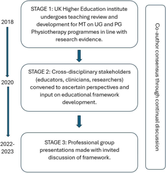 Methods: A literature review stimulated by a new method of teaching manual therapy, reflecting contemporary evidence, being trialled at a United Kingdom education institute. A group of experienced, internationally-based academics, clinicians, and researchers from across the spectrum of manual therapy was convened. Perspectives were elicited through reviews of contemporary literature and discussions in an iterative process. Public presentations were made to multidisciplinary groups and feedback was incorporated. Consensus was achieved through repeated discussion of relevant elements.