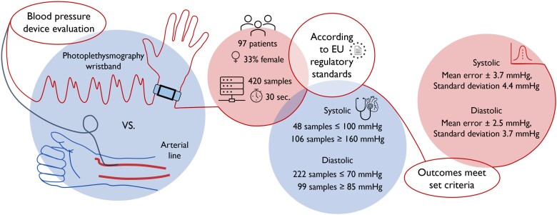 Methods and results: Predictions by a PPG-guided algorithm were compared to arterial BP measurements (in the sub-clavian artery), obtained during cardiac catheterization. Eligible patients were included and screened based on AAMI/European Society of Hypertension (ESH)/ISO Universal Standard requirements. The machine learning-based BP algorithm required three cuff-based initialization measurements in combination with ∼100 features (signal-derived and patient demographic-based). Ninety-seven patients and 420 samples were included. Mean age, weight, and height were 67.1 years (SD 11.1), 83.4 kg (SD 16.1), and 174 cm (SD 10), respectively. Systolic BP was ≤100 mmHg in 48 samples (11%) and ≥160 mmHg in 106 samples (25%). Diastolic BP was ≤70 mmHg in 222 samples (53%) and ≥85 mmHg in 99 samples (24%). The algorithm showed mean errors of ±3.7 mmHg (SD 4.4 mmHg) and ±2.5 mmHg (SD 3.7 mmHg) for systolic and diastolic BP, respectively. Similar results were observed across all genders and skin colours (Fitzpatrick I-VI).