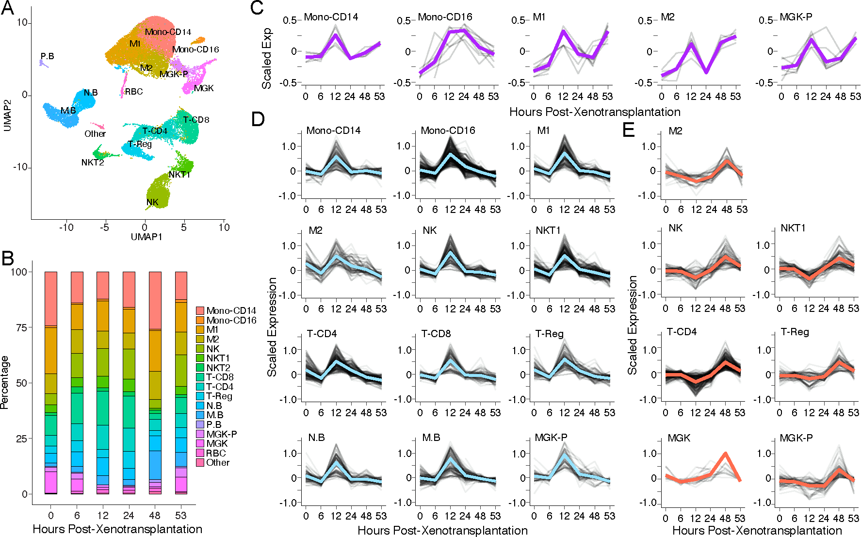 Methods: We performed single-cell RNA sequencing (scRNA-seq) and longitudinal RNA-seq analyses of the porcine kidneys to dissect xenotransplantation-associated cellular dynamics and xenograft-recipient interactions. We additionally performed longitudinal scRNA-seq of the peripheral blood mononuclear cells (PBMCs) to detect recipient immune responses across time.