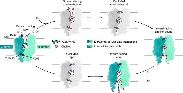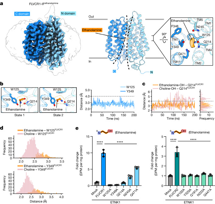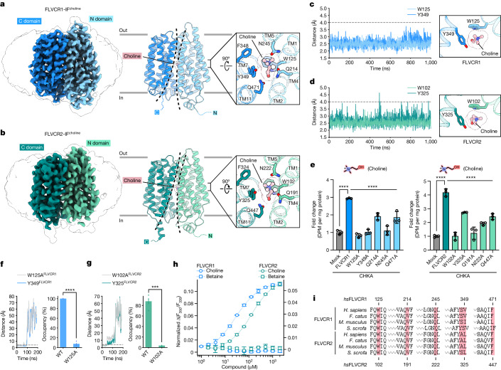 Human feline leukaemia virus subgroup C receptor-related proteins 1 and 2 (FLVCR1 and FLVCR2) are members of the major facilitator superfamily1. Their dysfunction is linked to several clinical disorders, including PCARP, HSAN and Fowler syndrome2-7. Earlier studies concluded that FLVCR1 may function as a haem exporter8-12, whereas FLVCR2 was suggested to act as a haem importer13, yet conclusive biochemical and detailed molecular evidence remained elusive for the function of both transporters14-16. Here, we show that FLVCR1 and FLVCR2 facilitate the transport of choline and ethanolamine across the plasma membrane, using a concentration-driven substrate translocation process. Through structural and computational analyses, we have identified distinct conformational states of FLVCRs and unravelled the coordination chemistry underlying their substrate interactions. Fully conserved tryptophan and tyrosine residues form the binding pocket of both transporters and confer selectivity for choline and ethanolamine through cation-π interactions. Our findings clarify the mechanisms of choline and ethanolamine transport by FLVCR1 and FLVCR2, enhance our comprehension of disease-associated mutations that interfere with these vital processes and shed light on the conformational dynamics of these major facilitator superfamily proteins during the transport cycle.