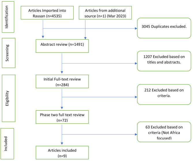 Results: Of an initial 4536 records retrieved, we screened the titles and abstracts of 1491 articles, and identified 72 articles for full review. Nine articles were selected for inclusion. Of these nine articles, five referenced West African countries including Liberia, Guinea and Sierra Leone, and experiences linked to the Ebola virus disease. Two articles focused on South Africa and Kenya, while the other two articles discussed more general experiences and pitfalls of ethics review during PHEs in Africa more broadly. We found no articles published on ethics review processes in Africa before the 2014 Ebola outbreak, and only a few before the COVID-19 outbreak. Although guidelines on protocol review and approval processes for PHEs were more frequently discussed after the 2014 Ebola outbreak, these did not focus on Africa specifically.