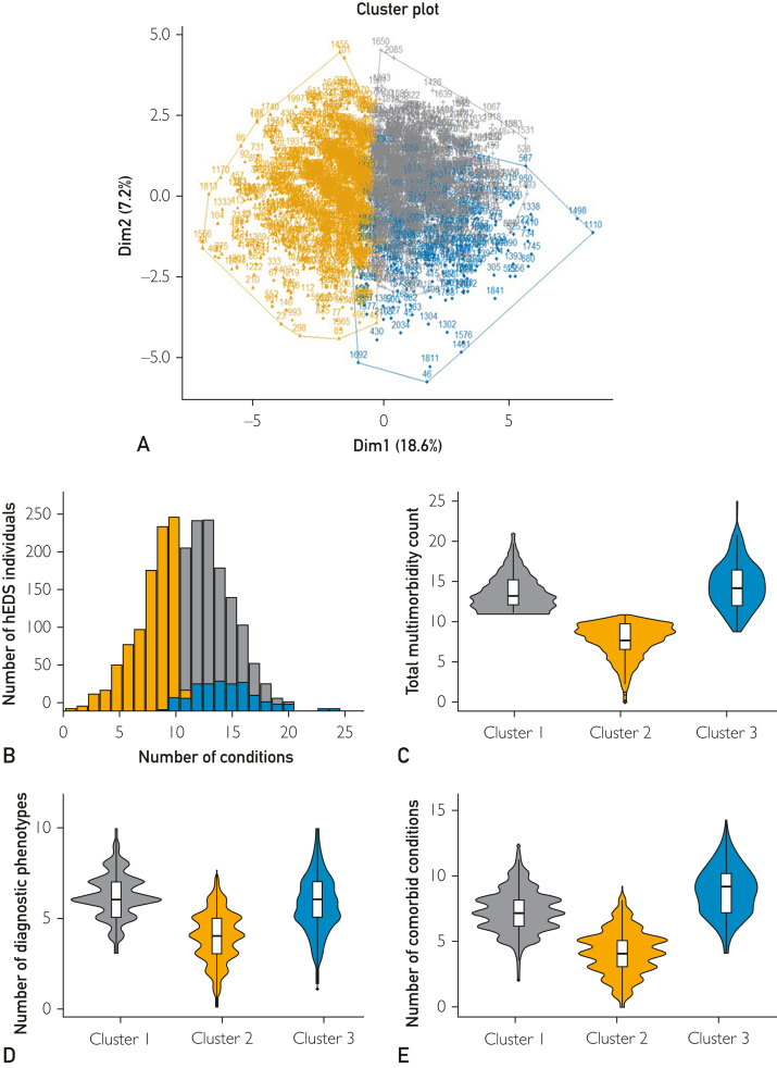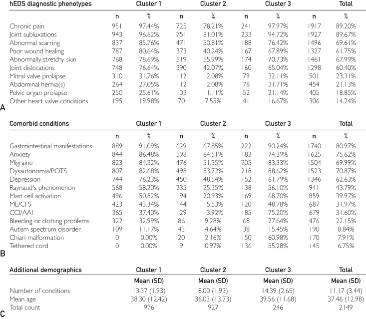 Results: Analysis of clinical manifestations in this cross-sectional cohort revealed insights into multimorbidity patterns across organ systems, identifying 3 distinct patient groups. Differences among these phenotypic clusters provided insights into diversity within the population with hEDS and indicated that Beighton scores are unreliable for multimorbidity phenotyping.
