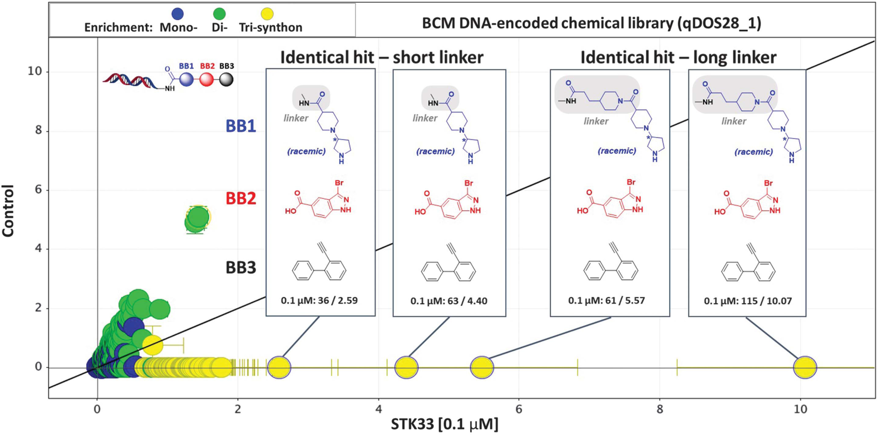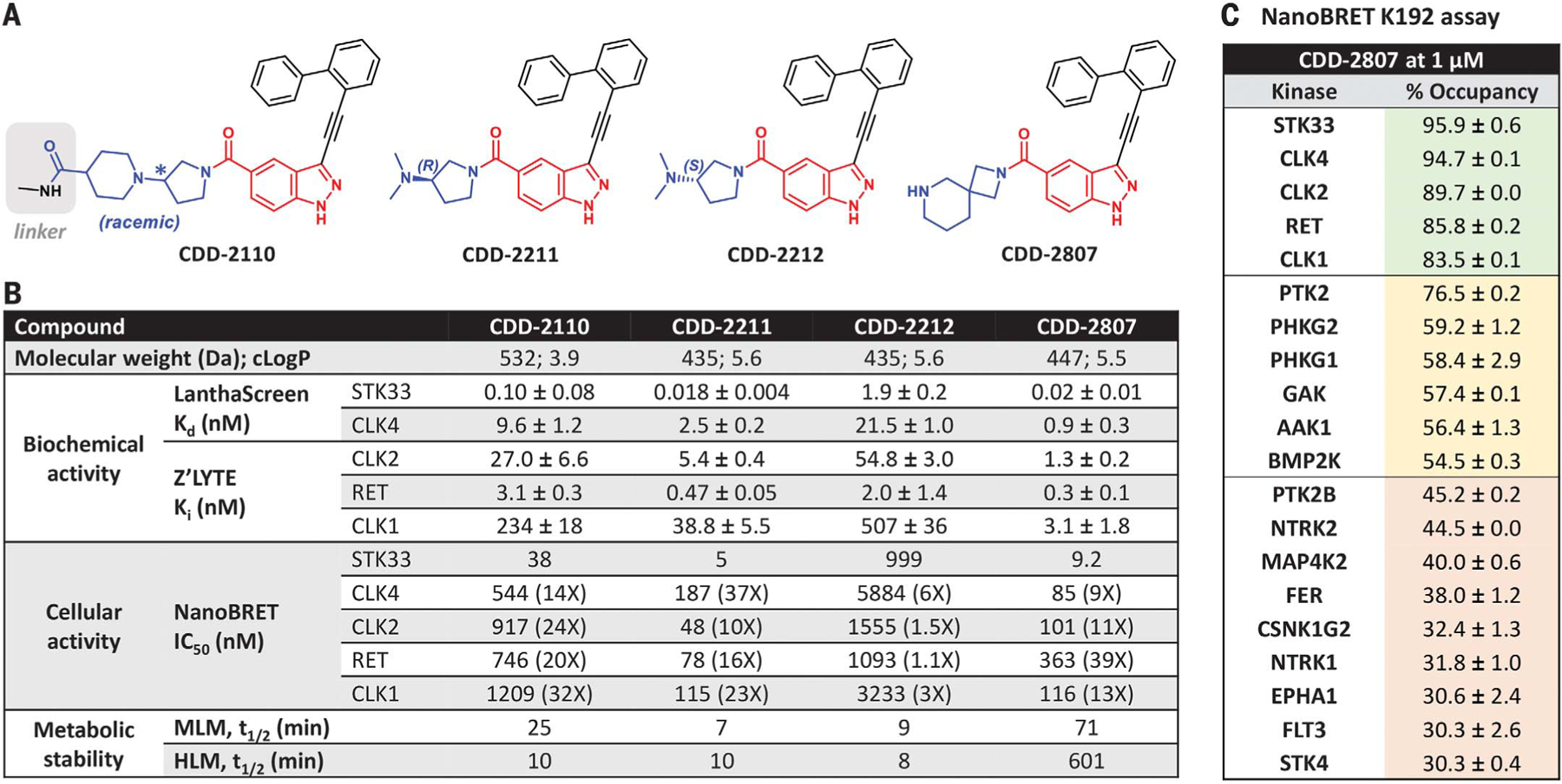 Men or mice with homozygous serine/threonine kinase 33 (STK33) mutations are sterile owing to defective sperm morphology and motility. To chemically evaluate STK33 for male contraception with STK33-specific inhibitors, we screened our multibillion-compound collection of DNA-encoded chemical libraries, uncovered potent STK33-specific inhibitors, determined the STK33 kinase domain structure bound with a truncated hit CDD-2211, and generated an optimized hit CDD-2807 that demonstrates nanomolar cellular potency (half-maximal inhibitory concentration = 9.2 nanomolar) and favorable metabolic stability. In mice, CDD-2807 exhibited no toxicity, efficiently crossed the blood-testis barrier, did not accumulate in brain, and induced a reversible contraceptive effect that phenocopied genetic STK33 perturbations without altering testis size. Thus, STK33 is a chemically validated, nonhormonal contraceptive target, and CDD-2807 is an effective tool compound.