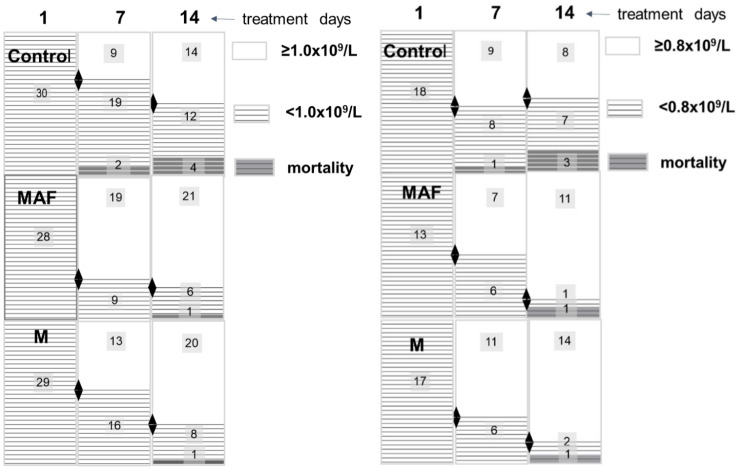Results: Median recovery time when patients did not require supplemental oxygen was 6 days in both study groups compared to 9 days in the control (MAF vs. control; P = 0.020 and M vs. control; P = 0.004). A greater reduction in mortality was seen in the MAF group compared to the control by day 14 (8.3% vs. 1.6%; P = 0.121) and by day 29 (15.3% vs. 3.2%; P = 0.020), and similarly in the M group by day 14 (8.3% vs. 2.9%; P = 0.276) and by day 29 (15.3% vs. 2.9%; P = 0.017). The proportion of those who had baseline absolute lymphocyte count (ALC) lower than 0.8 × 109/L was 13/63 (20.6%), 17/69 (24.6%), and 18/72 (25.0%) of patients in MAF, M, and control group respectively. Day 29 mortality among these lymphopenic patients was three times higher than for the intent-to-treat population (21% vs. 7%) and consisted in above subgroups: 2/13 (15%), 2/17 (12%), and 6/18 (33%) of patients. The decreased mortality in both study subgroups correlated with greater ALC restoration above 0.8 × 109/L level seen on day 14 in 91% (11/12) and 87.5% (14/16) of survivors in MAF and M subgroups respectively compared to 53.3% (8/15) of survivors in control subgroup. Incidences of any ALC decrease below the baseline level on day 14 occurred in 25.4% of patients in the MAF group and 29.0% of patients in the M group compared to 45.8% in control and ALC depletion by ≥ 50% from the baseline level consisted of 7.9%, 5.8%, and 15.3% of cases in these groups respectively.