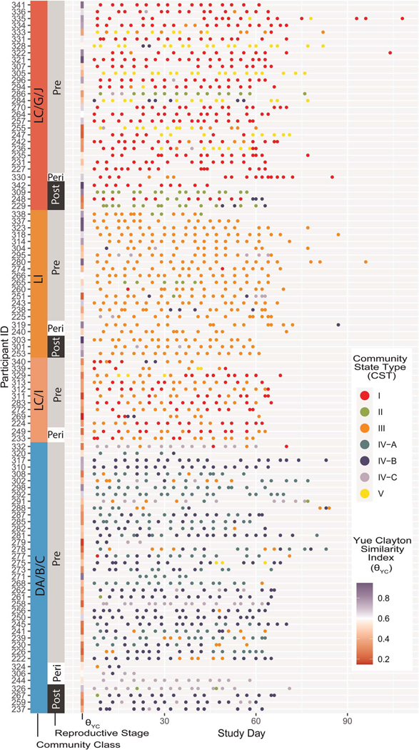 Methods: Pre- (n = 83), peri- (n = 8), and postmenopausal (n = 11) participants provided twice-weekly mid-vaginal samples (total, 1,556; average, 15 per participant) over 8 weeks in an observational study. Composition of the vaginal microbiota was characterized by 16S rRNA gene amplicon sequencing, and a community state type (CST) was assigned to each sample. Clustering of longitudinal CST profiles, CST transition rates, duration of low-Lactobacillus/high bacterial diversity CSTs, and other metrics of bacterial community dynamics were assessed across reproductive stages.