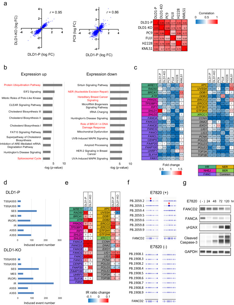 E7820 and Indisulam (E7070) are sulfonamide molecular glues that modulate RNA splicing by degrading the splicing factor RBM39 via ternary complex formation with the E3 ligase adaptor DCAF15. To identify biomarkers of the antitumor efficacy of E7820, we treated patient-derived xenograft (PDX) mouse models established from 42 patients with solid tumors. The overall response rate was 38.1% (16 PDXs), and tumor regression was observed across various tumor types. Exome sequencing of the PDX genome revealed that loss-of-function mutations in genes of the homologous recombination repair (HRR) system, such as ATM, were significantly enriched in tumors that responded to E7820 (p = 4.5 × 103). Interestingly, E7820-mediated double-strand breaks in DNA were increased in tumors with BRCA2 dysfunction, and knockdown of BRCA1/2 transcripts or knockout of ATM, ATR, or BAP1 sensitized cancer cells to E7820. Transcriptomic analyses revealed that E7820 treatment resulted in the intron retention of mRNAs and decreased transcription, especially for HRR genes. This induced HRR malfunction probably leads to the synthetic lethality of tumor cells with homologous recombination deficiency (HRD). Furthermore, E7820, in combination with olaparib, exerted a synergistic effect, and E7820 was even effective in an olaparib-resistant cell line. In conclusion, HRD is a promising predictive biomarker of E7820 efficacy and has a high potential to improve the prognosis of patients with HRD-positive cancers.