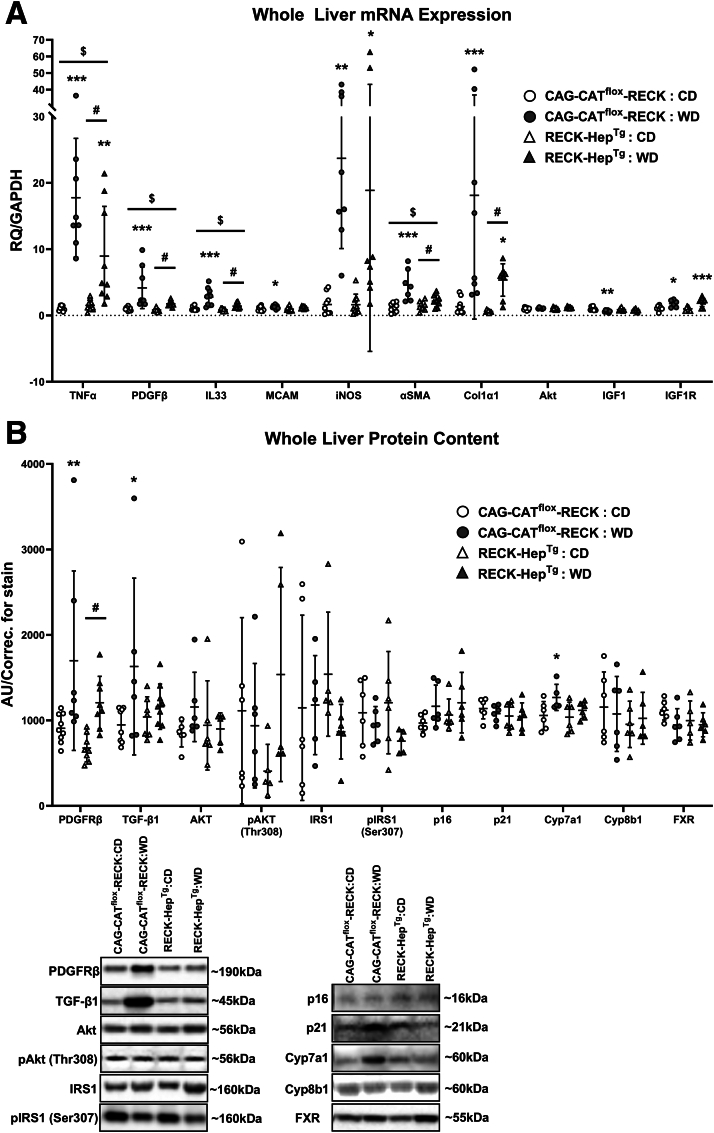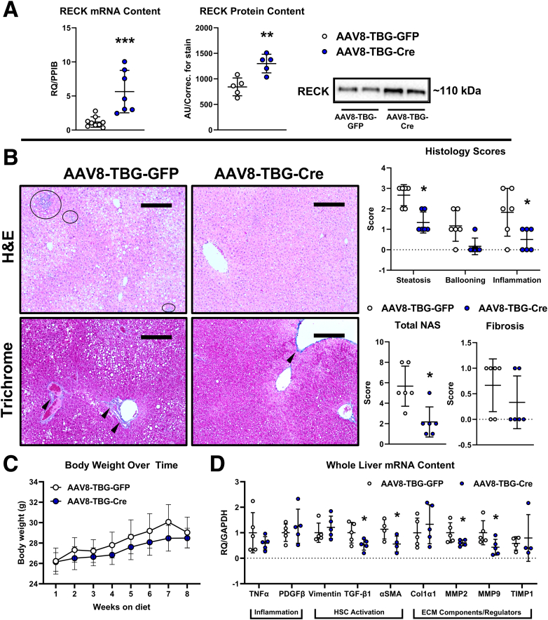 Methods: We generated a novel transgenic mouse model with RECK overexpression specifically in hepatocytes to investigate its role in Western diet (WD)-induced liver disease. Proteomic analysis and in vitro studies were performed to mechanistically link RECK to hepatic inflammation and fibrosis.