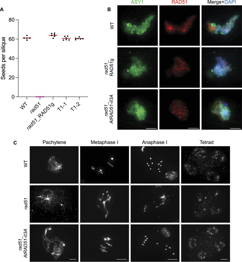 Homologous recombination is a major pathway for the repair of DNA double strand breaks, essential both to maintain genomic integrity and to generate genetic diversity. Mechanistically, homologous recombination involves the use of a homologous DNA molecule as a template to repair the break. In eukaryotes, the search for and invasion of the homologous DNA molecule is carried out by two recombinases, RAD51 in somatic cells and RAD51 and DMC1 in meiotic cells. During recombination, the recombinases bind overhanging single-stranded DNA ends to form a nucleoprotein filament, which is the active species in promoting DNA invasion and strand exchange. RAD51 and DMC1 carry two major DNA-binding sites-essential for nucleofilament formation and DNA strand exchange, respectively. Here, we show that the function of RAD51 DNA-binding site II is conserved in the plant, Arabidopsis. Mutation of three key amino acids in site II does not affect RAD51 nucleofilament formation but inhibits its recombinogenic activity, analogous to results from studies of the yeast and human proteins. We further confirm that recombinogenic function of RAD51 DNA-binding site II is not required for meiotic double-strand break repair when DMC1 is present. The Arabidopsis AtRAD51-II3A separation of function mutant shows a dominant negative phenotype, pointing to distinct biochemical properties of eukaryotic RAD51 proteins.