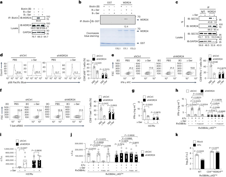 Adaptation to hypoxia is a major challenge for the survival of Mycobacterium tuberculosis (Mtb) in vivo. Interferon (IFN)-γ-producing CD8+ T cells contribute to control of Mtb infection, in part by promoting antimicrobial activities of macrophages. Whether Mtb counters these responses, particularly during hypoxic conditions, remains unknown. Using metabolomic, proteomic and genetic approaches, here we show that Mtb induced Rv0884c (SerC), an Mtb phosphoserine aminotransferase, to produce D-serine. This activity increased Mtb pathogenesis in mice but did not directly affect intramacrophage Mtb survival. Instead, D-serine inhibited IFN-γ production by CD8+ T cells, which indirectly reduced the ability of macrophages to restrict Mtb upon co-culture. Mechanistically, D-serine interacted with WDR24 and inhibited mTORC1 activation in CD8+ T cells. This decreased T-bet expression and reduced IFN-γ production by CD8+ T cells. Our findings suggest an Mtb evasion mechanism where pathogen metabolic adaptation to hypoxia leads to amino acid-dependent suppression of adaptive anti-TB immunity.