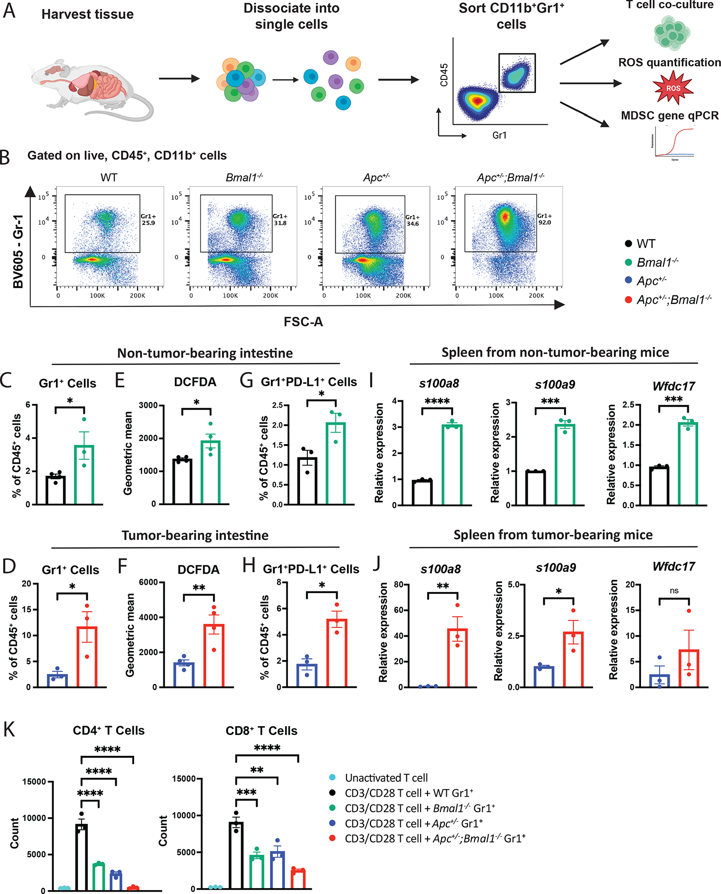 The circadian clock is a critical regulator of immunity, and this circadian control of immune modulation has an essential function in host defense and tumor immunosurveillance. Here we use a single-cell RNA sequencing approach and a genetic model of colorectal cancer to identify clock-dependent changes to the immune landscape that control the abundance of immunosuppressive cells and consequent suppression of cytotoxic CD8+ T cells. Of these immunosuppressive cell types, PD-L1-expressing myeloid-derived suppressor cells (MDSCs) peak in abundance in a rhythmic manner. Disruption of the epithelial cell clock regulates the secretion of cytokines that promote heightened inflammation, recruitment of neutrophils and the subsequent development of MDSCs. We also show that time-of-day anti-PD-L1 delivery is most effective when synchronized with the abundance of immunosuppressive MDSCs. Collectively, these data indicate that circadian gating of tumor immunosuppression informs the timing and efficacy of immune checkpoint inhibitors.