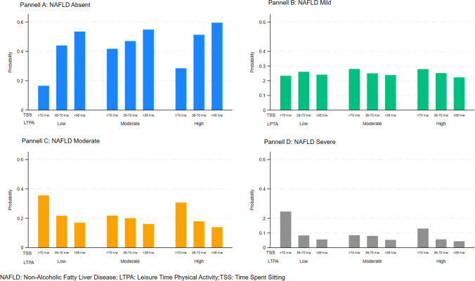 Key results: The probability of having mild, moderate, and severe NAFLD tends to decrease with increasing LTPA and decreasing TSS levels. We selected a combination of participants aged 50 years and older stratified by gender. Men had a statistically significant difference in the probability of developing moderate NAFLD if they spent 70 h per week sitting and had low LTPA, while among women there was a statistically significant difference in the probability of developing mild or moderate NAFLD if they had moderate LPTA and spent 35-70 h/week sitting.