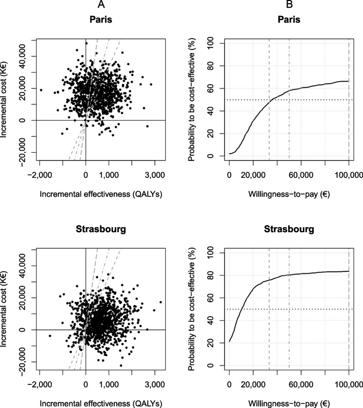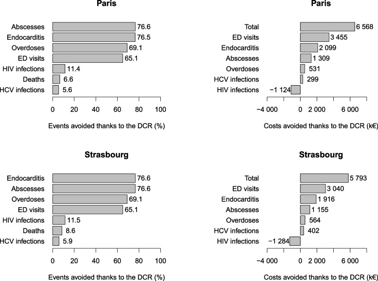 Results: The numbers of abscesses and associated infective endocarditis, drug overdoses, and emergency department visits decreased significantly in PWID attending DCRs (-77%, -69%, and -65%, respectively) but the impact on HIV and HCV infections was modest (-11% and -6%, respectively). This resulted in savings of €6.6 (Paris) and €5.8 (Strasbourg) millions of medical costs. The ICER of DRCs was €30,600/QALY (Paris) and €9,200/QALY (Strasbourg). In scenario analysis where drug consumption spaces are implemented inside existing harm reduction structures, these ICERs decreased to €21,400/QALY and €2,500/QALY, respectively.
