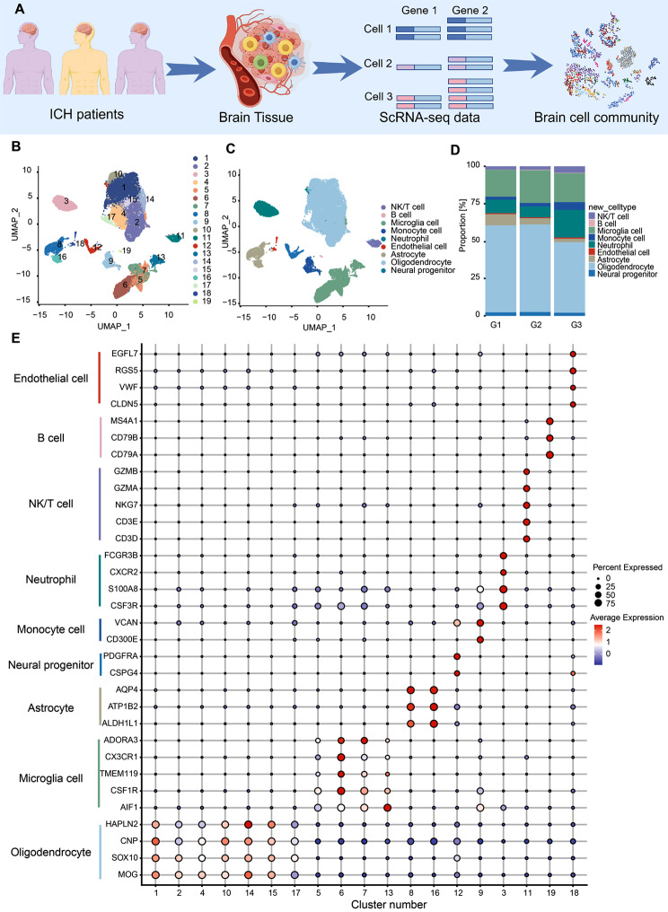Methods: 9 patients with basal ganglia intracerebral hemorrhage (hematoma volume 50-100 ml) were enrolled in this study. A multi-stage profile was developed, comprising Group1 (n = 3, 0-6 h post-ICH, G1), Group2 (n = 3, 6-24 h post-ICH, G2), and Group3 (n = 3, 24-48 h post-ICH, G3). A minimal quantity of edematous tissue surrounding the hematoma was preserved during hematoma evacuation. Single cell RNA sequencing (scRNA-seq) was used to map immune cell populations within comprehensively resected PHE samples collected from patients at different stages after ICH.