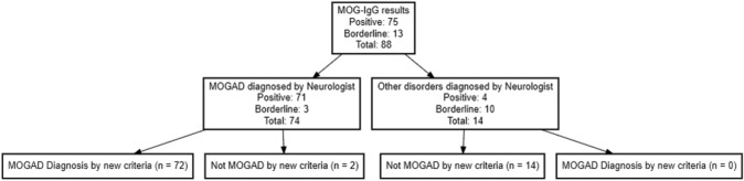 Methods: This retrospective study, conducted at Hadassah Medical Center, included 88 patients with MOG-IgG antibodies. Patients with a positive or borderline MOG-IgG antibodies by cell-based assay were included. Demographics, clinical and MRI data were recorded. Cases were divided into definite MOGAD and Non-MOGAD groups as determined by the treating physician. We assessed the sensitivity and specificity of the new criteria in comparison to treating physicians' evaluations. Additionally, we examined clinical differences between the MOGAD and Non-MOGAD groups.