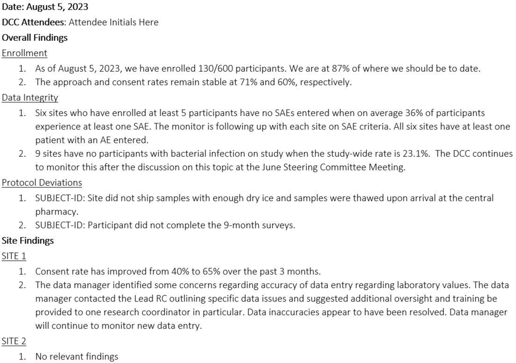Methods: Our study teams assess the study's overall risk, document heightened and critical risks, and create a study-specific risk-based monitoring plan, integrating SDM and Central Data Monitoring (CDM). SDM combines a fixed list of pre-identified variables and a list of randomly identified variables to monitor. Identifying variables follows a two-step approach: first, a random sample of participants is selected, second, a random set of variables for each participant selected is identified. Sampling weights prioritize critical variables. Regular team meetings are held to discuss and compile significant findings into a Study Monitoring Report.