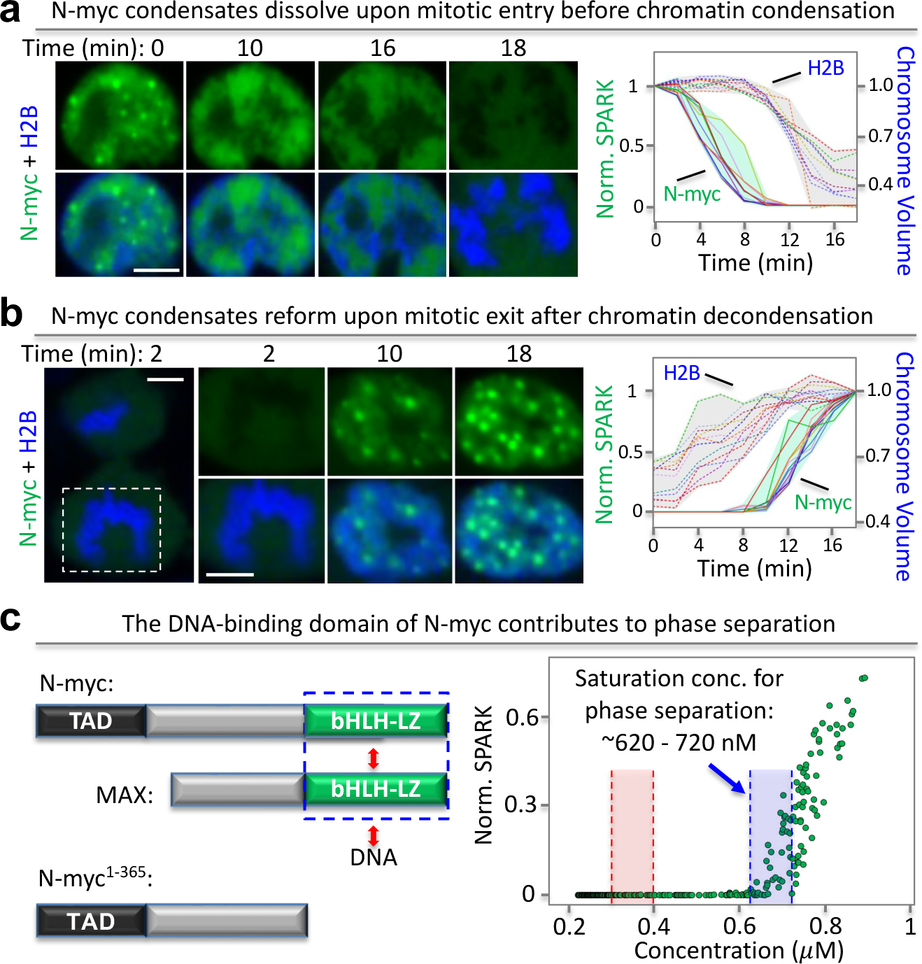 Dysregulation and enhanced expression of MYC transcription factors (TFs) including MYC and MYCN contribute to the majority of human cancers. For example, MYCN is amplified up to several hundredfold in high-risk neuroblastoma. The resulting overexpression of N-myc aberrantly activates genes that are not activated at low N-myc levels and drives cell proliferation. Whether increasing N-myc levels simply mediates binding to lower-affinity binding sites in the genome or fundamentally changes the activation process remains unclear. One such activation mechanism that could become important above threshold levels of N-myc is the formation of aberrant transcriptional condensates through phase separation. Phase separation has recently been linked to transcriptional regulation, but the extent to which it contributes to gene activation remains an open question. Here we characterized the phase behavior of N-myc and showed that it can form dynamic condensates that have transcriptional hallmarks. We tested the role of phase separation in N-myc-regulated transcription by using a chemogenetic tool that allowed us to compare non-phase-separated and phase-separated conditions at equivalent N-myc levels, both of which showed a strong impact on gene expression compared to no N-myc expression. Interestingly, we discovered that only a small percentage (<3%) of N-myc-regulated genes is further modulated by phase separation but that these events include the activation of key oncogenes and the repression of tumor suppressors. Indeed, phase separation increases cell proliferation, corroborating the biological effects of the transcriptional changes. However, our results also show that >97% of N-myc-regulated genes are not affected by N-myc phase separation, demonstrating that soluble complexes of TFs with the transcriptional machinery are sufficient to activate transcription.