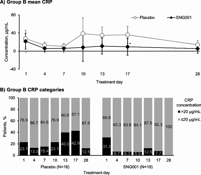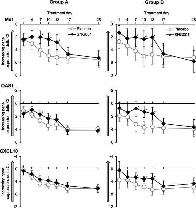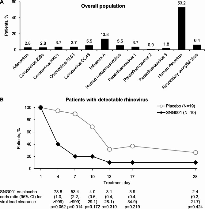 Results: In Part 1, SNG001 upregulated sputum interferon gene expression. In Part 2, there were minimal SNG001-placebo differences in the efficacy endpoints; however, whereas gene expression was initially upregulated by viral infection, then declined on placebo, levels were maintained with SNG001. Furthermore, the proportion of patients with detectable rhinovirus (the most common virus) on Day 7 was lower with SNG001. In Group B, serum C-reactive protein and the proportion of patients with purulent sputum increased with placebo (suggesting bacterial infection), but not with SNG001. The overall adverse event incidence was similar with both treatments.