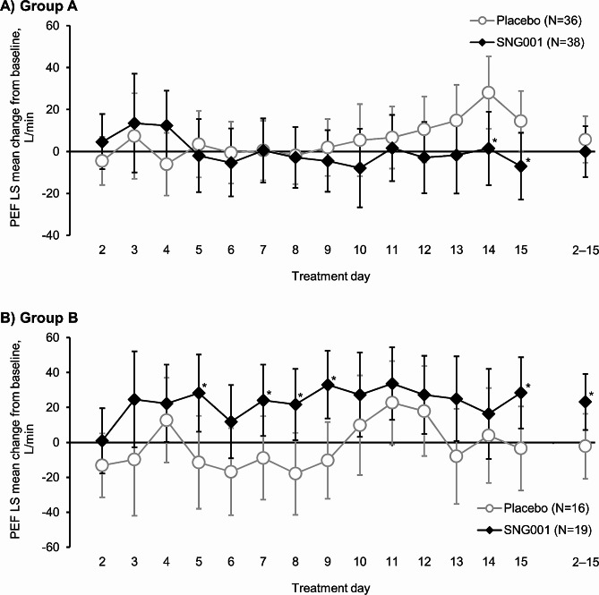 Methods: In Part 1, patients (N = 13) with stable COPD were randomised 4:1 to SNG001 or placebo once-daily for three days. In Part 2, patients (N = 109) with worsening symptoms and a positive respiratory viral test were randomised 1:1 to SNG001 or placebo once-daily for 14 days in two Groups: A (no moderate exacerbation); B (moderate COPD exacerbation [i.e., acute worsening of respiratory symptoms treated with antibiotics and/or oral corticosteroids]).