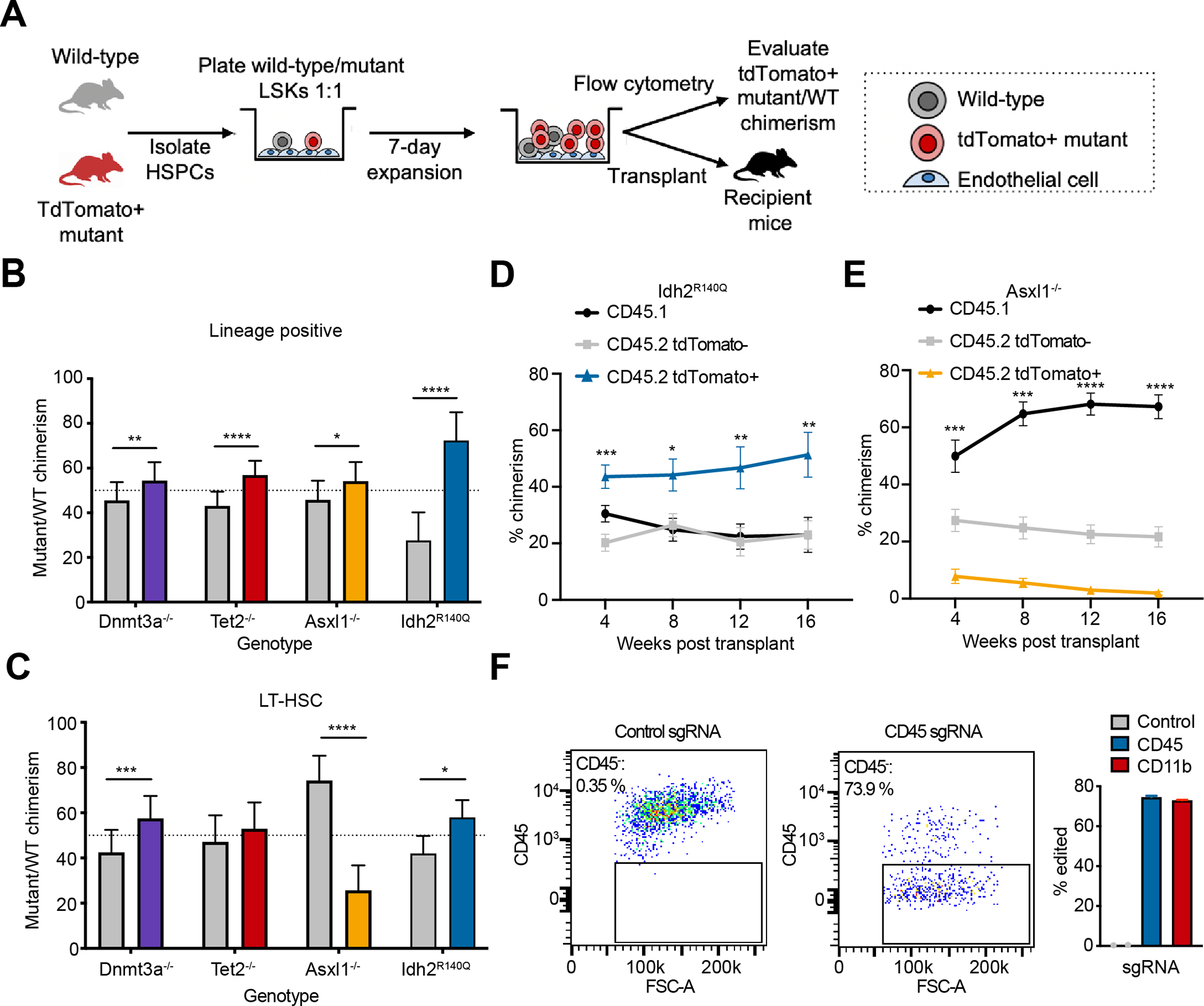 Clonal hematopoiesis (CH) is a common premalignant state in the blood and confers an increased risk of blood cancers and all-cause mortality. Identification of therapeutic targets in CH has been hindered by the lack of an ex vivo platform amenable for studying primary hematopoietic stem and progenitor cells (HSPCs). Here, we utilize an ex vivo co-culture system of HSPCs with bone marrow endothelial cells to perform CRISPR/Cas9 screens in mutant HSPCs. Our data reveal that loss of the histone demethylase family members Kdm3b and Jmjd1c specifically reduces the fitness of Idh2- and Tet2-mutant HSPCs. Kdm3b loss in mutant cells leads to decreased expression of critical cytokine receptors including Mpl, rendering mutant HSPCs preferentially susceptible to inhibition of downstream JAK2 signaling. Our study nominates an epigenetic regulator and an epigenetically regulated receptor signaling pathway as genotype-specific therapeutic targets and provides a scalable platform to identify genetic dependencies in mutant HSPCs. Significance: Given the broad prevalence, comorbidities, and risk of malignant transformation associated with CH, there is an unmet need to identify therapeutic targets. We develop an ex vivo platform to perform CRISPR/Cas9 screens in primary HSPCs. We identify KDM3B and downstream signaling components as genotype-specific dependencies in CH and myeloid malignancies. See related commentary by Khabusheva and Goodell, p. 1768.