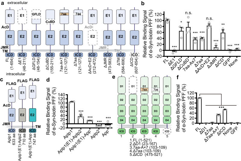 Pathologic α-synuclein (α-syn) spreads from cell-to-cell, in part, through binding to the lymphocyte-activation gene 3 (Lag3). Here we report that amyloid β precursor-like protein 1 (Aplp1) interacts with Lag3 that facilitates the binding, internalization, transmission, and toxicity of pathologic α-syn. Deletion of both Aplp1 and Lag3 eliminates the loss of dopaminergic neurons and the accompanying behavioral deficits induced by α-syn preformed fibrils (PFF). Anti-Lag3 prevents the internalization of α-syn PFF by disrupting the interaction of Aplp1 and Lag3, and blocks the neurodegeneration induced by α-syn PFF in vivo. The identification of Aplp1 and the interplay with Lag3 for α-syn PFF induced pathology deepens our insight about molecular mechanisms of cell-to-cell transmission of pathologic α-syn and provides additional targets for therapeutic strategies aimed at preventing neurodegeneration in Parkinson's disease and related α-synucleinopathies.