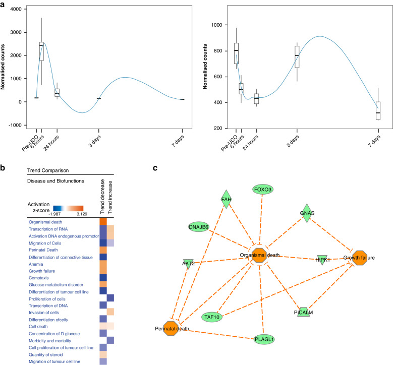 Results: Sixty-one genes were identified with significant altered expression after UCO. In pre-UCO blood, the level of three mRNAs (Trex2, Znf280b, novel miRNA) and in post-UCO, four mRNAs (Fam184a, Angptl2, novel lincRNA and an unknown protein-coding gene) were associated to brain injury (FDR < 0.01). Several of these mRNAs are related to inflammation and angiogenesis. Pathway analysis highlighted genes playing a role in perinatal death and growth failure. Results also indicate that several leukocyte populations undergo significant changes after UCO.