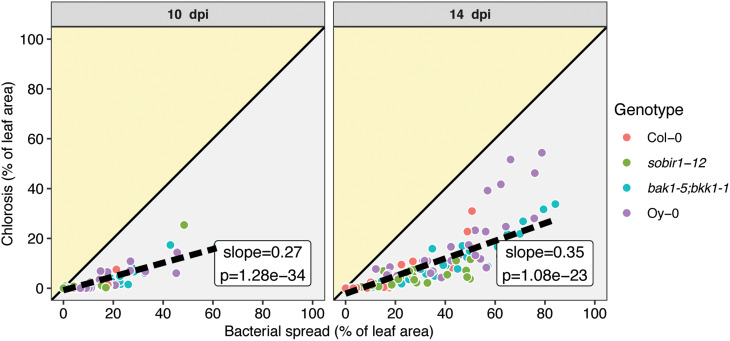 Results: Here we report on an image analysis tool called ScAnalyzer to monitor disease symptoms and bacterial spread in Arabidopsis thaliana leaves. Thereto, detached leaves are assembled in a grid and scanned, which enables automated separation of individual samples. A pixel color threshold is used to segment healthy (green) from chlorotic (yellow) leaf areas. The spread of luminescence-tagged bacteria is monitored via light-sensitive films, which are processed in a similar manner as the leaf scans. We show that this tool is able to capture previously identified differences in susceptibility of the model plant A. thaliana to the bacterial pathogen Xanthomonas campestris pv. campestris. Moreover, we show that the ScAnalyzer pipeline provides a more detailed assessment of bacterial spread within plant leaves than previously used methods. Finally, by combining the disease symptom values with bacterial spread values from the same leaves, we show that bacterial spread precedes visual disease symptoms.