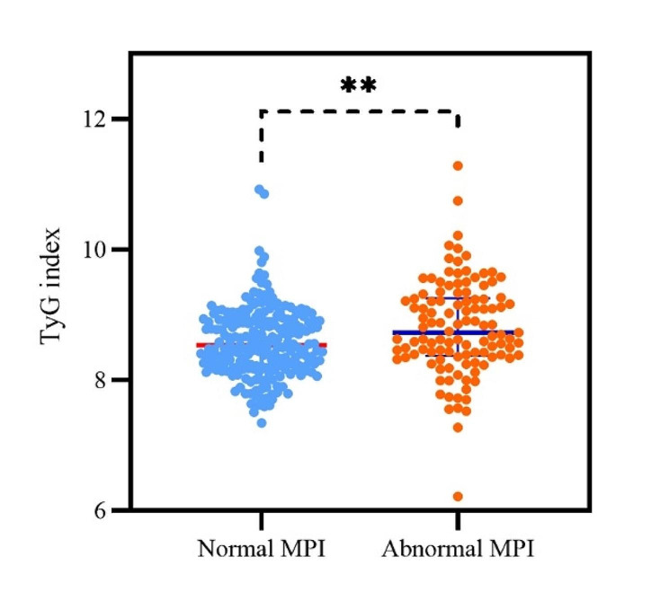 Methods: INOCA patients who underwent both coronary angiography and myocardial perfusion imaging (MPI) were included consecutively. All participants were divided into three groups according to TyG tertiles (T1, T2, and T3). Abnormal MPI for myocardial ischemia in individual coronary territories was defined as summed stress score (SSS) ≥ 4 and summed difference score (SDS) ≥ 2. SSS refers to the sum of all defects in the stress images, and SDS is the difference of the sum of all defects between the rest images and stress images. All patients were followed up for major adverse cardiac events (MACE).