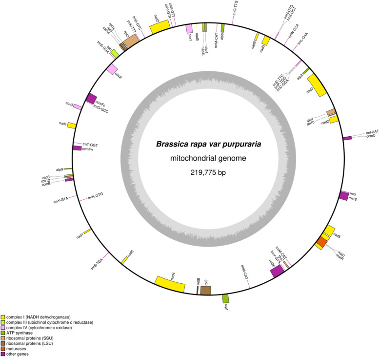 Results: The mt genome of B. rapa var. purpuraria was assembled through the Illumina and Nanopore sequencing platforms, which revealed a length of 219,775 bp with a typical circular structure. The base composition of the whole B. rapa var. purpuraria mt genome revealed A (27.45%), T (27.31%), C (22.91%), and G (22.32%). 59 functional genes, composing of 33 protein-coding genes (PCGs), 23 tRNA genes, and 3 rRNA genes, were annotated. The sequence repeats, codon usage, RNA editing, nucleotide diversity and gene transfer between the cp genome and mt genome were examined in the B. rapa var. purpuraria mt genome. Phylogenetic analysis show that B. rapa var. Purpuraria was closely related to B. rapa subsp. Oleifera and B. juncea. Ka/Ks analysis reflected that most of the PCGs in the B. rapa var. Purpuraria were negatively selected, illustrating that those mt genes were conserved during evolution.