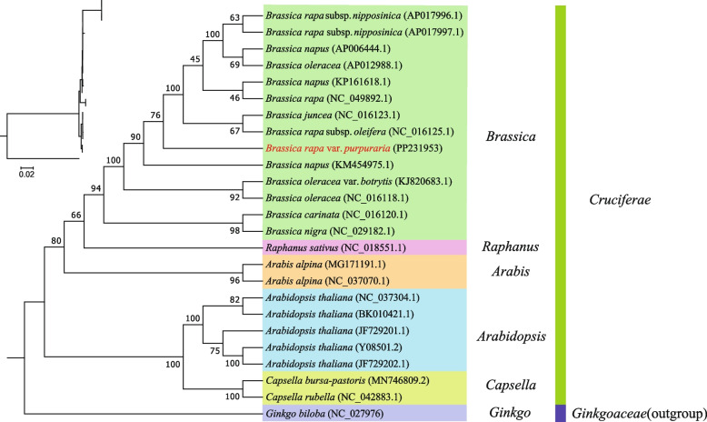 Keywords: Brassica rapa var. Purpuraria; Mitochondrial genome; Phylogenetic analysis; RNA editing; Repeat sequence.