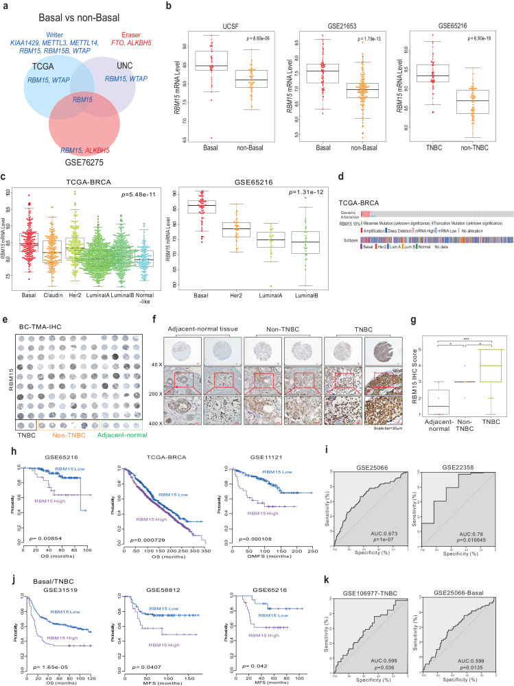 N6-adenosine methylation (m6A) is critical for controlling cancer cell growth and tumorigenesis. However, the function and detailed mechanism of how m6A methyltransferases modulate m6A levels on specific targets remain unknown. In the current study, we identified significantly elevated levels of RBM15, an m6A writer, in basal-like breast cancer (BC) patients compared to nonbasal-like BC patients and linked this increase to worse clinical outcomes. Gene expression profiling revealed correlations between RBM15 and serine and glycine metabolic genes, including PHGDH, PSAT1, PSPH, and SHMT2. RBM15 influences m6A levels and, specifically, the m6A levels of serine and glycine metabolic genes via direct binding to target RNA. The effects of RBM15 on cell growth were largely dependent on serine and glycine metabolism. Thus, RBM15 coordinates cancer cell growth through altered serine and glycine metabolism, suggesting that RBM15 is a new therapeutic target in BC.