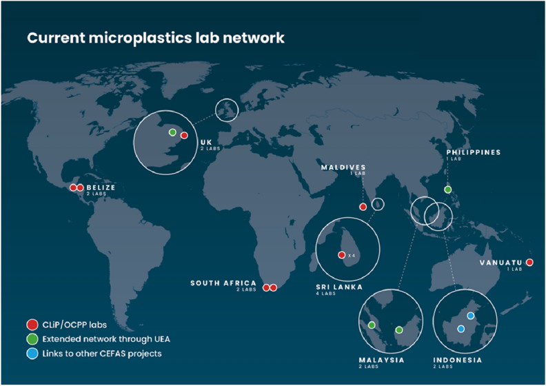 Infrastructure is often a limiting factor in microplastics research impacting the production of scientific outputs and monitoring data. International projects are therefore required to promote collaboration and development of national and regional scientific hubs. The Commonwealth Litter Programme and the Ocean Country Partnership Programme were developed to support Global South countries to take actions on plastics entering the oceans. An international laboratory network was developed to provide the infrastructure and in country capacity to conduct the collection and processing of microplastics in environmental samples. The laboratory network was also extended to include a network developed by the University of East Anglia, UK. All the laboratories were provided with similar equipment for the collection, processing and analysis of microplastics in environmental samples. Harmonised protocols and training were also provided in country during laboratory setup to ensure comparability of quality-controlled outputs between laboratories. Such large networks are needed to produce comparable baseline and monitoring assessments.
