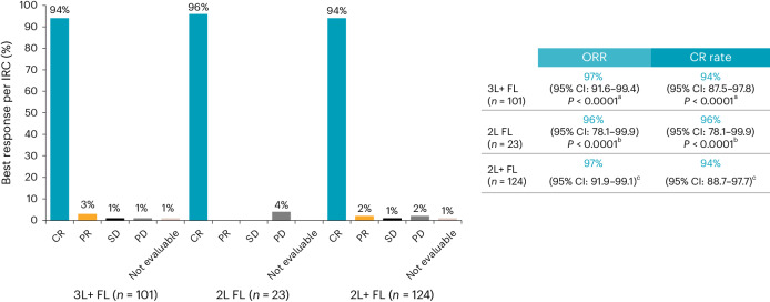 An unmet need exists for patients with relapsed/refractory (R/R) follicular lymphoma (FL) and high-risk disease features, such as progression of disease within 24 months (POD24) from first-line immunochemotherapy or disease refractory to both CD20-targeting agent and alkylator (double refractory), due to no established standard of care and poor outcomes. Chimeric antigen receptor (CAR) T cell therapy is an option in R/R FL after two or more lines of prior systemic therapy, but there is no consensus on its optimal timing in the disease course of FL, and there are no data in second-line (2L) treatment of patients with high-risk features. Lisocabtagene maraleucel (liso-cel) is an autologous, CD19-directed, 4-1BB CAR T cell product. The phase 2 TRANSCEND FL study evaluated liso-cel in patients with R/R FL, including 2L patients who all had POD24 from diagnosis after treatment with anti-CD20 antibody and alkylator ≤6 months of FL diagnosis and/or met modified Groupe d'Etude des Lymphomes Folliculaires criteria. Primary/key secondary endpoints were independent review committee-assessed overall response rate (ORR)/complete response (CR) rate. At data cutoff, 130 patients had received liso-cel (median follow-up, 18.9 months). Primary/key secondary endpoints were met. In third-line or later FL (n = 101), ORR was 97% (95% confidence interval (CI): 91.6‒99.4), and CR rate was 94% (95% CI: 87.5‒97.8). In 2L FL (n = 23), ORR was 96% (95% CI: 78.1‒99.9); all responders achieved CR. Cytokine release syndrome occurred in 58% of patients (grade ≥3, 1%); neurological events occurred in 15% of patients (grade ≥3, 2%). Liso-cel demonstrated efficacy and safety in patients with R/R FL, including high-risk 2L FL. ClinicalTrials.gov identifier: NCT04245839 .