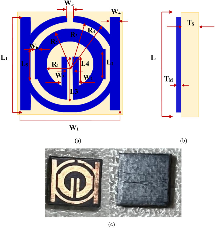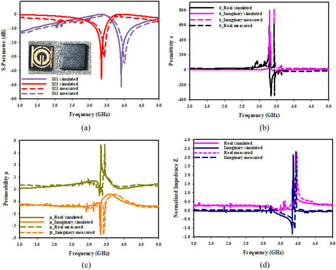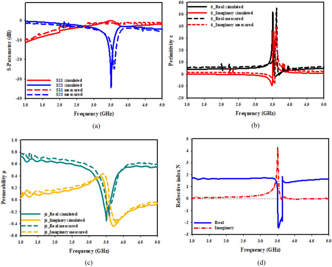 The concept, performance, and analyses of distinctive, miniaturized metamaterial (MTM) unit cell addressing the forthcoming Sub 6 GHz 5G applications are presented in this paper. Two circular split-ring resonators (CSRR) with two parallel rectangular copper elements in front of the design and a slotted square element in the background make up the suggested metamaterial. It has a line segment with tunable features that is positioned in the center of the little ring copper structure. The suggested design offers a significant operating frequency band of 220 MHz together with a resonance of transmission coefficient S21 at 3.5 GHz. Furthermore, in two (z & x) principal axes of wave propagation, wide-range achievement, single/double-negative (S/DNG) refractive index, negative permittivity, and near-zero permeability properties were demonstrated. Through varying central slotted-strip line length, resonance frequencies can be selectively altered. Moreover, the metamaterial has overall dimensions of 9 × 9 mm2 and is composed on a Rogers 5880 RT substrate. In order to create the suggested MTM's equivalent circuit, which shows similar coefficient of transmission (S21), a proposed design's numerical simulation is carried out in the CST micro-wave studio. This simulation is after that put to comparison with manufacturing of the design.
