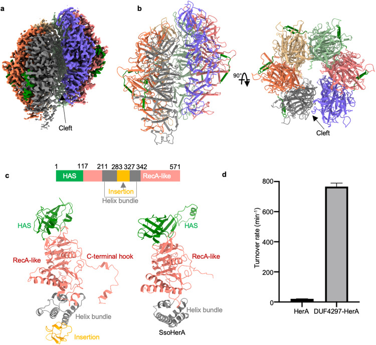Coupling distinct enzymatic effectors emerges as an efficient strategy for defense against phage infection in bacterial immune responses, such as the widely studied nuclease and cyclase activities in the type III CRISPR-Cas system. However, concerted enzymatic activities in other bacterial defense systems are poorly understood. Here, we biochemically and structurally characterize a two-component defense system DUF4297-HerA, demonstrating that DUF4297-HerA confers resistance against phage infection by cooperatively cleaving dsDNA and hydrolyzing ATP. DUF4297 alone forms a dimer, and HerA alone exists as a nonplanar split spiral hexamer, both of which exhibit extremely low enzymatic activity. Interestingly, DUF4297 and HerA assemble into an approximately 1 MDa supramolecular complex, where two layers of DUF4297 (6 DUF4297 molecules per layer) linked via inter-layer dimerization of neighboring DUF4297 molecules are stacked on top of the HerA hexamer. Importantly, the complex assembly promotes dimerization of DUF4297 molecules in the upper layer and enables a transition of HerA from a nonplanar hexamer to a planar hexamer, thus activating their respective enzymatic activities to abrogate phage infection. Together, our findings not only characterize a novel dual-enzyme anti-phage defense system, but also reveal a unique activation mechanism by cooperative complex assembly in bacterial immunity.