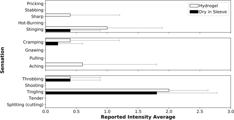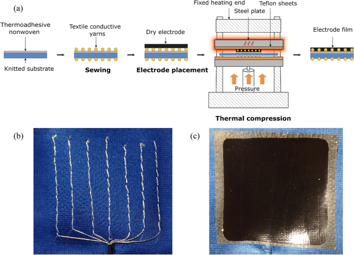 Results: The carbon-based dry electrode is integrated into the textile substrate by a thermal compression molding process on an embroidered conductive matrix. This matrix is composed of textile silver-plated conductive yarns and is linked to the stimulator. Besides ensuring the electrical connection, the matrix improves the fixation between the textile substrate and the electrode. The stimulation intensity, the perceived comfort and the muscle torque generated by the smart FES sleeve were compared to hydrogel electrodes. The results show a better average comfort and a higher average stimulation intensity with the smart FES sleeve, while there were no significant differences for the muscle torque generated.