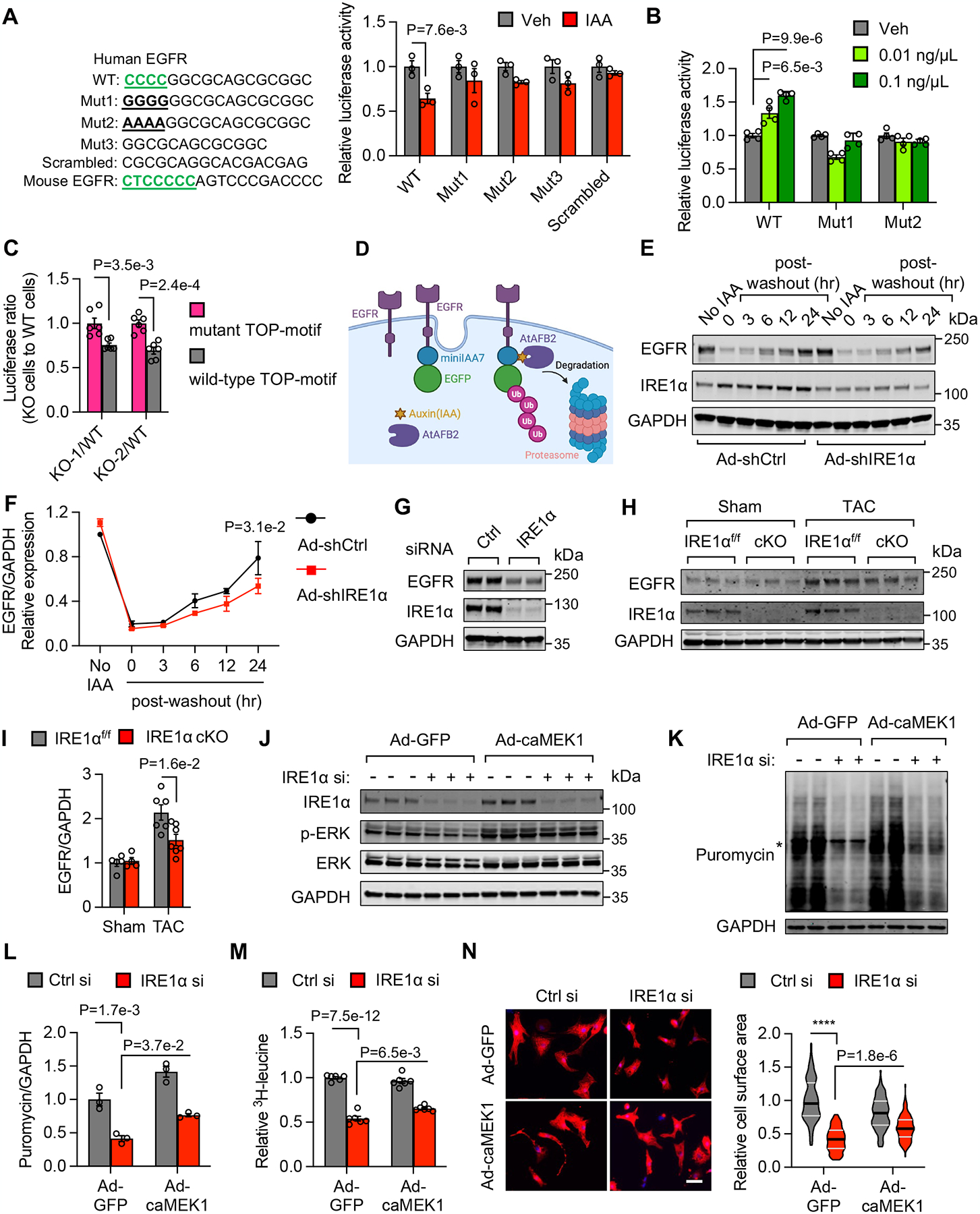 Results: We show that IRE1α is required for cell growth in neonatal rat ventricular myocytes under prohypertrophy treatment and in HEK293 cells in response to serum stimulation. At the molecular level, IRE1α directly interacts with eIF4G and eIF3, 2 critical components of the translation initiation complex. We demonstrate that IRE1α facilitates the formation of the translation initiation complex around the endoplasmic reticulum and preferentially initiates the translation of transcripts with 5' terminal oligopyrimidine motifs. We then reveal that IRE1α plays an important role in determining the selectivity and translation of these transcripts. We next show that IRE1α stimulates the translation of epidermal growth factor receptor through an unannotated terminal oligopyrimidine motif in its 5' untranslated region. We further demonstrate a physiological role of IRE1α-governed protein translation by showing that IRE1α is essential for cardiomyocyte growth and cardiac functional maintenance under hemodynamic stress in vivo.