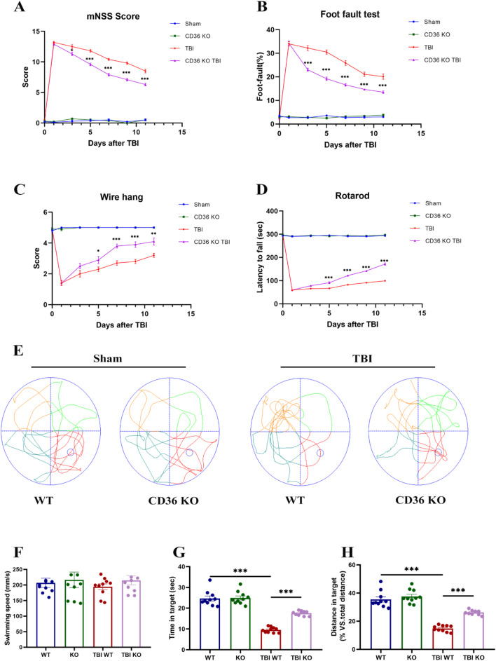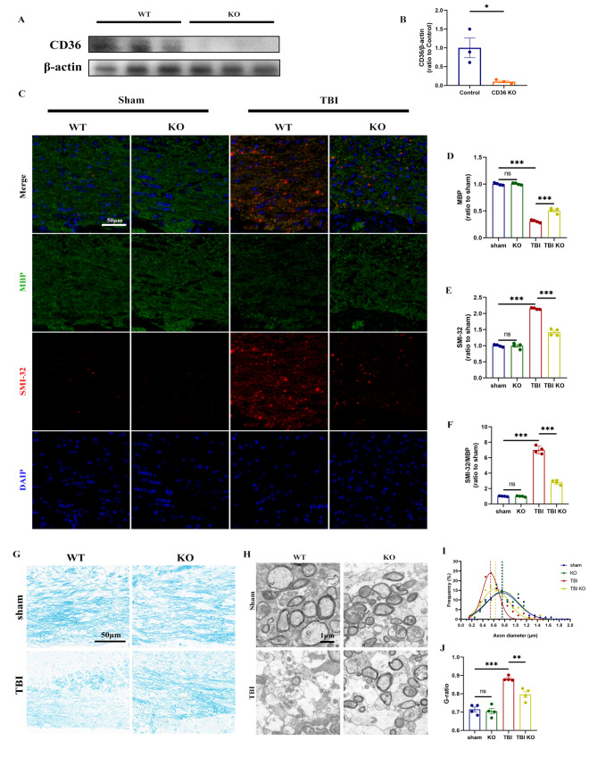 Results: Western blot and qPCR analyses revealed that CD36 expression reached its zenith at 7 days post-TBI and remained sustained at this level thereafter. Immunofluorescence staining exhibited robust CD36 expression in astrocytes and microglia following TBI. Genetic deletion of CD36 ameliorated TBI-induced white matter injury, as evidenced by a reduced SMI-32/MBP ratio and G-ratio. Transcriptome sequencing unveiled differentially expressed genes enriched in processes linked to microglial activation, regulation of neuroinflammation, and the TNF signaling pathway. Additionally, bioinformatics analysis pinpointed the Traf5-p38 axis as a critical signaling pathway. In vivo and in vitro experiments indicated that inhibition of the CD36-Traf5-MAPK axis curtailed microglial polarization toward the pro-inflammatory phenotype. In a Transwell co-culture system, BV2 cells treated with LPS + IFN-γ exacerbated the damage of post-OGD oligodendrocytes, which could be rectified through CD36 knockdown in BV2 cells.