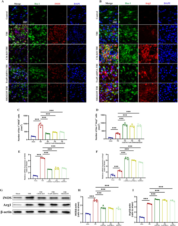 Conclusions: This study illuminates that the suppression of CD36 mitigates WMI by constraining microglial polarization towards the pro-inflammatory phenotype through the down-regulation of the Traf5-MAPK signaling pathway. Our findings present a potential therapeutic strategy for averting neuroinflammatory responses and ensuing WMI damage resulting from TBI.