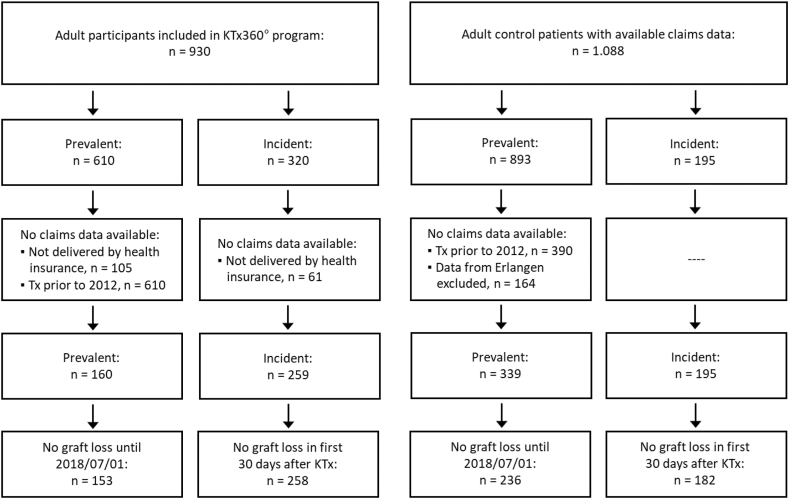 Findings: In total, 930 adult participants were recruited at three different transplant centres in Germany, of whom 320 were incident (enrolled within the first year after KTx) and 610 prevalent (enrolled >1 year after KTx) patients. Due to differences in the availability of the claims data, the claims data of 411 participants and 418 controls could be used for the analyses. In the prevalent group we detected a significantly lower risk for graft failure in the study participants compared to the matched controls (HR = 0.13, 95% CI = 0.04-0.39, p = 0.005, n = 389 observations), whereas this difference could not be detected in the incident group (HR = 0.92, 95% CI = 0.54-1.56, p = 0.837, n = 440 observations).