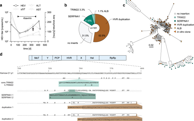 Hepatitis E virus (HEV) is a long-neglected RNA virus and the major causative agent of acute viral hepatitis in humans. Recent data suggest that HEV has a very heterogeneous hypervariable region (HVR), which can tolerate major genomic rearrangements. In this study, we identify insertions of previously undescribed sequence snippets in serum samples of a ribavirin treatment failure patient. These insertions increase viral replication while not affecting sensitivity towards ribavirin in a subgenomic replicon assay. All insertions contain a predicted nuclear localization sequence and alanine scanning mutagenesis of lysine residues in the HVR influences viral replication. Sequential replacement of lysine residues additionally alters intracellular localization in a fluorescence dye-coupled construct. Furthermore, distinct sequence patterns outside the HVR are identified as viral determinants that recapitulate the enhancing effect. In conclusion, patient-derived insertions can increase HEV replication and synergistically acting viral determinants in and outside the HVR are described. These results will help to understand the underlying principles of viral adaptation by viral- and host-sequence snatching during the clinical course of infection.