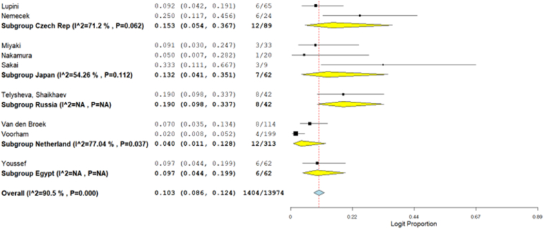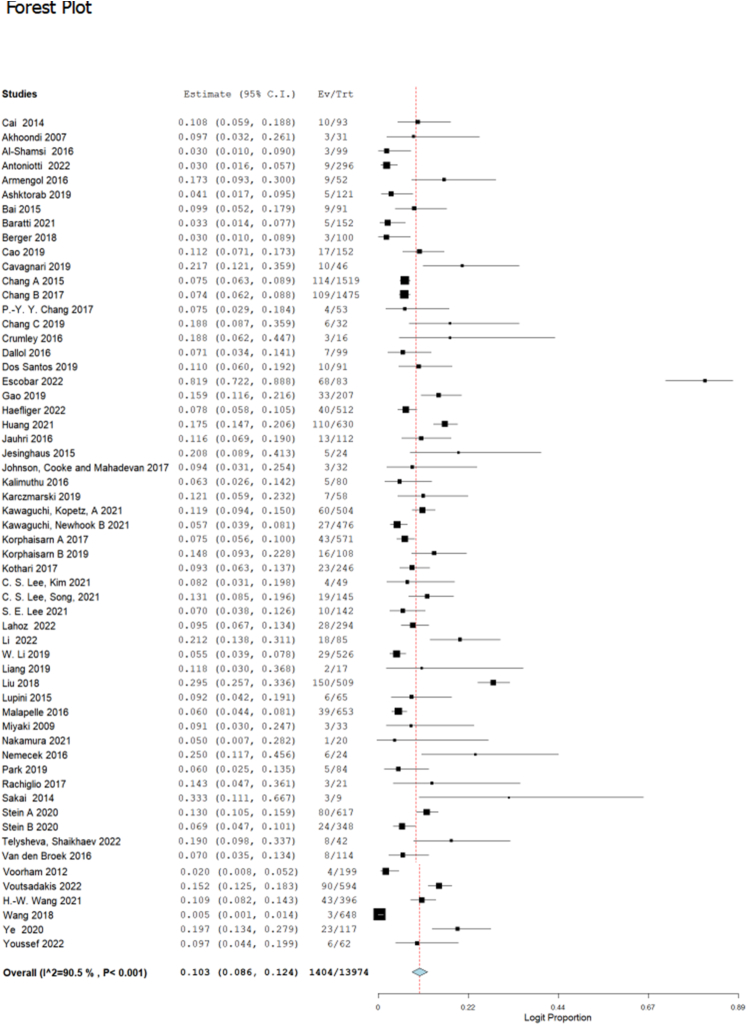 Results: This meta-analysis involves 13,974 respondents; most were males 7825/13,974, (56.0 %). Overall prevalence of FBXW7 mutations was 10.3 %, (95%CI: 8.6-12.4), I2 = 90.5 %, (P < 0.001). The occurrence of FBXW7 mutations was highest in Russia [19.0 %, (95%CI: 9.8-33.7)] and Taiwan [18.8 %, (95%CI: 8.7-35.9)], P-values< 0.05 while the least prevalence was reported in Netherland (4 %) and Italy (5 %), both P-values< 0.001. Overall prevalence of FBXW7 abberation was greatest amongst male gender: "53.9 %, (95%CI: 8.3-62.0 %)", Tumour location (colon): 59.8 %, (95%CI: 53.9-65), tumour site (left): 61.6 %, (95%CI: 53.8-68.9), Tumour-grade (Moderate): 65.9 %, (95%CI: 54.9-75.4 %), and Tumour late-stage: 67.9 %, (95%CI: 49.7-84.3 %), all P-values< 0.001. When stratified according to study-period, an increasing trend was noted from 2018 till present with the highest mutation rate recorded in 2022 (15.3 %).