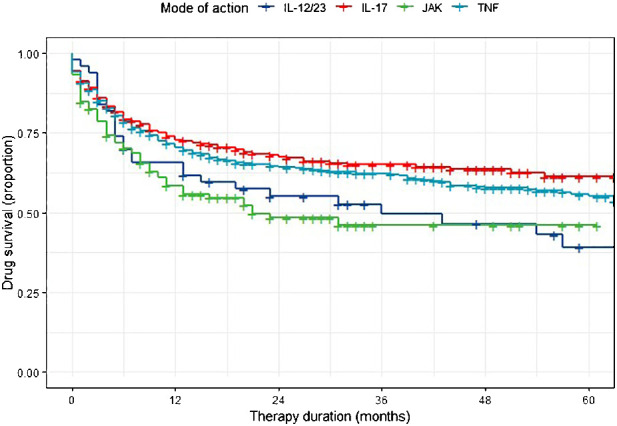 Drug survival superiority of tumor necrosis factor inhibitors and interleukin-17 inhibitors over Janus kinase inhibitors and interleukin-12/23 inhibitors in German psoriatic arthritis outpatients: retrospective analysis of the RHADAR database
