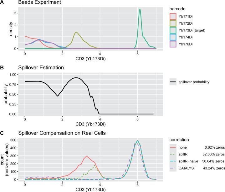 Results: We implement our method in an R package spillR using expectation-maximization to fit the mixture model. We test our method on simulated, semi-simulated, and real data from CATALYST. We find that our method compensates low counts accurately, does not introduce negative counts, avoids overcompensating high counts, and preserves correlations between markers that may be biologically meaningful.